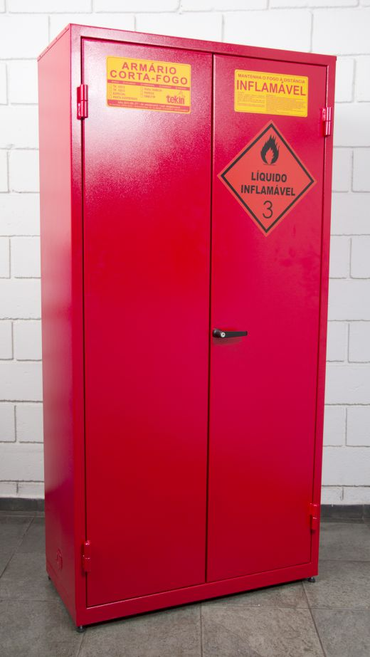 O armário corta-fogo modelo para inflamáveis apresenta dimensões externas de 2000mm de altura, 1000mm de largura e 450mm de profundidade. Construído com chapas de aço carbono tanto interna quanto externamente, o armário é preenchido entre essas chapas com um material isolante resistente em todo o seu perímetro.